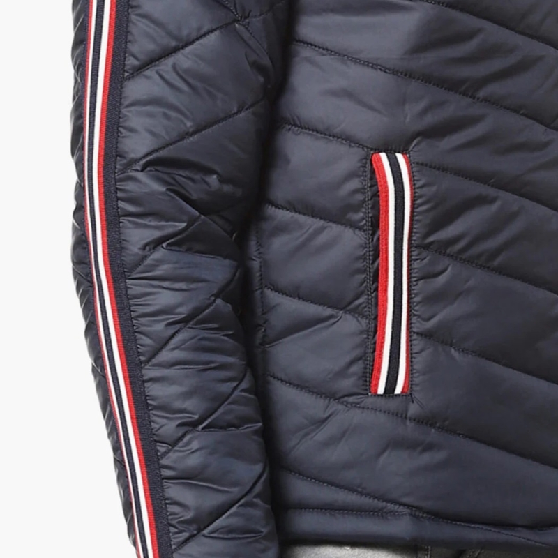 الأزرق الداكن الهندسي الذاتي تصميم سترة مبطنة ، لديه غطاء رأس ، جيوب 2 ، لديه إغلاق الرمز البريدي ، أكمام طويلة ، حاشية مستقيمة ، بطانة من البوليستر.