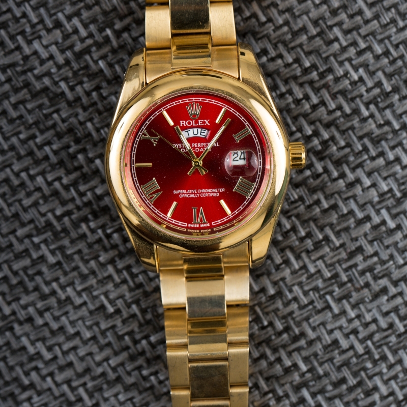 • This Oyster Perpetual DAY-DATE 40 in 18 CT yellow gold with a red dial, fluted bezel and a president bracelet.