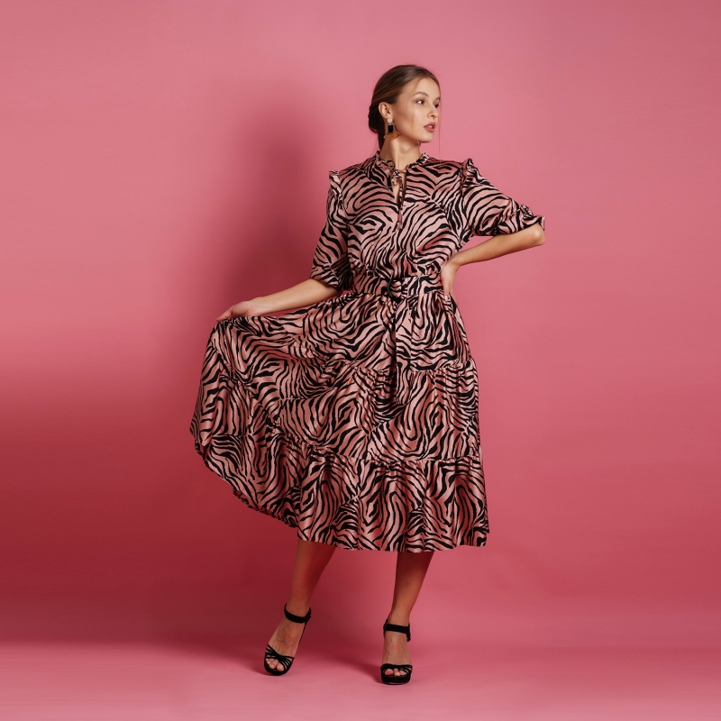 Pink printed women A-line dress, has a round neck, three-quarter sleeves, an attached lining, and flared hem