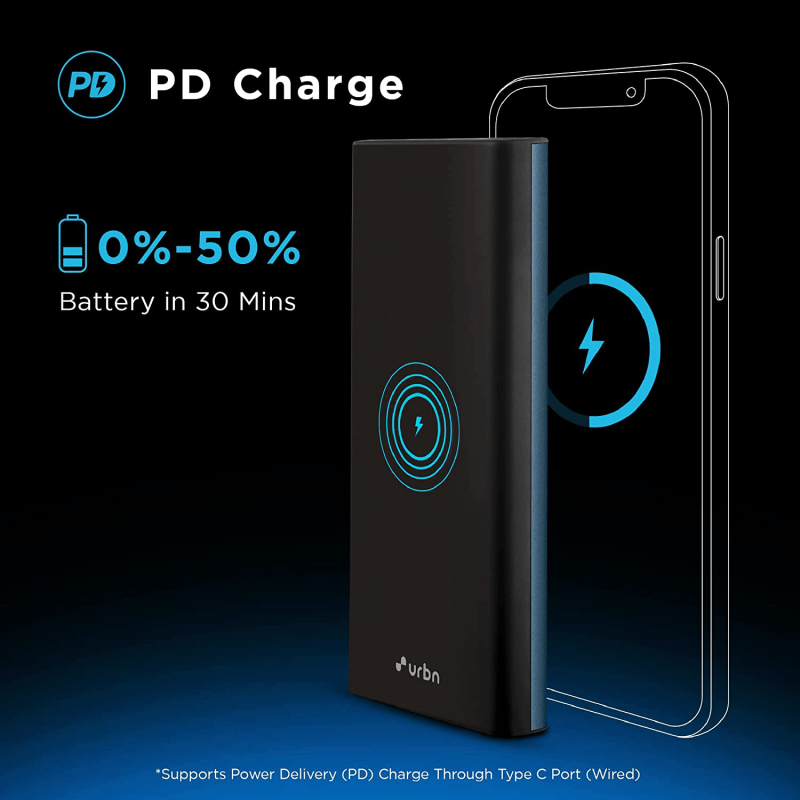 10000 mAh Wireless Power Bank with Super Fast 15W wireless charging and 22.5W wired charging charges your phone around 2 times in a flash with just one full charge.